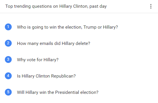 Por ejemplo, la pregunta que más se han hecho los internautas en Google, tanto en el caso de Trump como en el de Clinton ha sido: “¿Quién ganará las elecciones?”. Dejando a un lado esa manía que tenemos de creer que el buscador es la Bruja Lola (lo mismo pasó cuando se celebró el Brexit) la respuesta a esa pregunta es evidente: depende de lo que votéis los mismos que lo estáis buscando…
