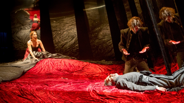 El movimiento, la acción, guían el desarrollo de la obra y la estructura con la que Zurro, a partir de la traducción de Leandro Fernández de Moratín, ofrece fluidez a los acontecimientos y al sentido final de su protagonista. Según Hamlet dramatiza su locura para engaño de su tío, el rey Claudio (Juan Motilla), y todos los que le rodean, y la sombra negra de la conciencia se precipita como mancha imborrable en el espacio asfixiante del palacio, más deforme parece la presencia de sus habitantes frente a los ocho espejos inclinados que ocupan la escena y menos sólido el suelo tejido que pisan. La austera e impactante escenografía y el vestuario, suntuoso de entrada y parco en el tramo último, ideado por Curt Allen Wilmer, exteriorizan a los ojos de testigos el flujo de traiciones, ambiciones y desesperanzas a las que la corrupción y la muerte son coetáneas a la par. La moral corrompida arrasa con todo como las glorias pasadas se consumen en estiércol cuando el cuerpo inerte besa la tierra.